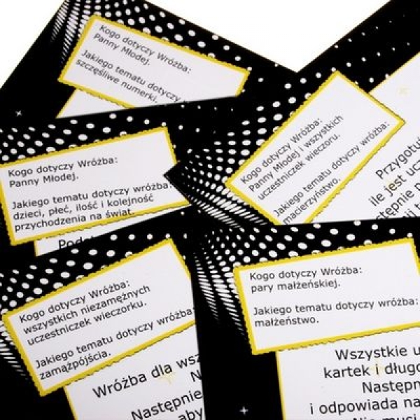 - zawartość zestawu: 12 kart z wróżbami, wyniki wróżb, zasady gry