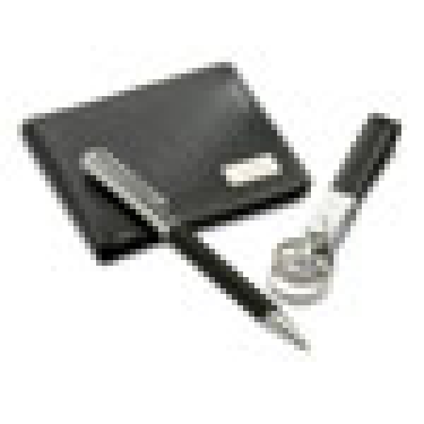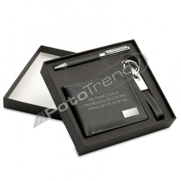 Zestaw zawiera portfel, długopis i breloczek, zapakowany w eleganckie czarne pudełko. W cenie zestawu wchodzi możliwość wygrawerowania dedykacji na portfelu.